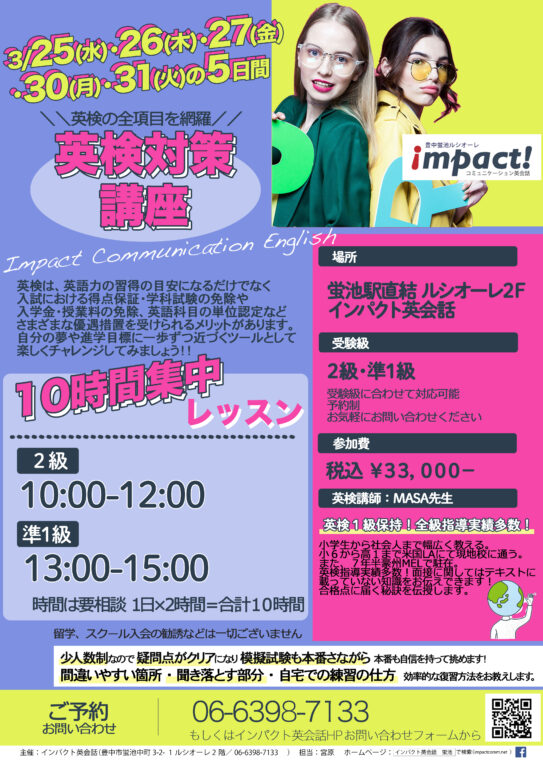 ルシオーレ2Fのインパクト英会話にて、英検®全項目を網羅する「10時間集中対策講座」を開講します。 一次試験対策から二次面接(スピーキング)まで、プロ講師の直接指導で一気にスコアアップを目指しませんか? 【本講座のポイ…