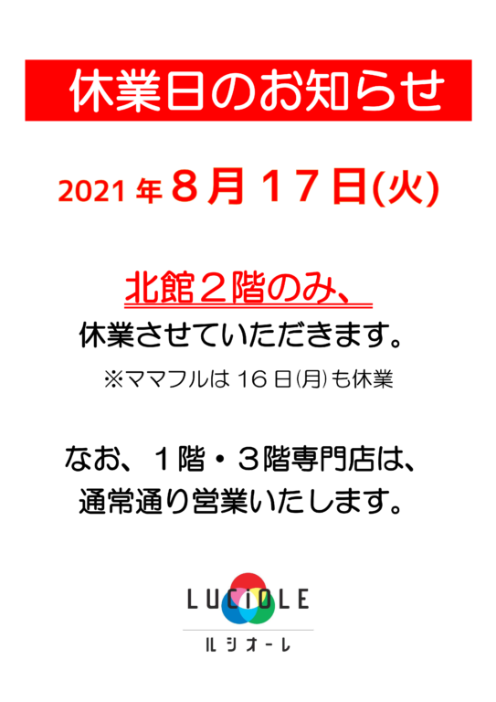 北館2階のみ、休業させていただきます。 ※ママフルは 8月16 日(月曜日)も休業いたします。